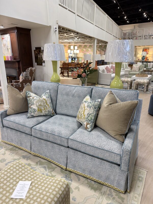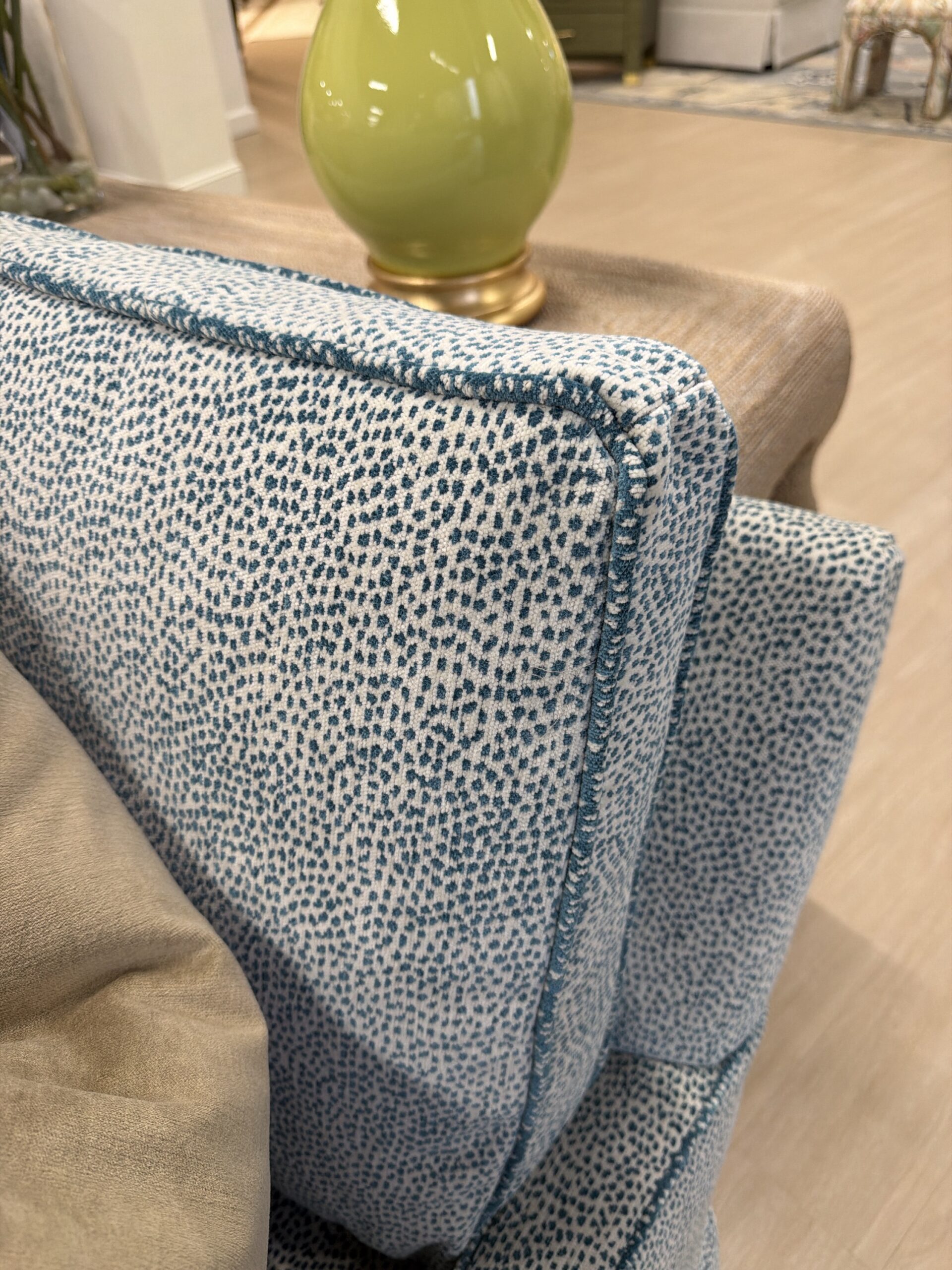 Wesley Hall three over three sofa covered in Siamese turquoise with the reverse side welting!
